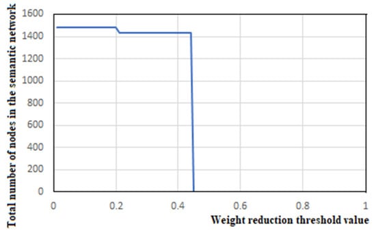 It should be noted that the choice of a weight reduction threshold is essential. Figure 1 shows the dependence of the total number of nodes in the semantic network on the selected value of the weight reduction threshold for a small text of 50 words.