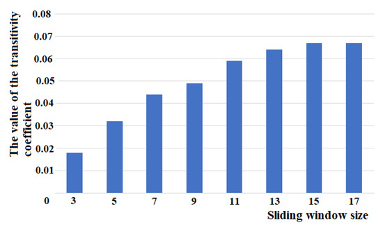 The results presented in Figure 3 show that when the size of the sliding window is 11 nodes or more, the value of the transitivity coefficient changes very little. However, taking into account that the computational costs increase greatly with an increase in its size, the size of the sliding window can be chosen to be equal to 11.