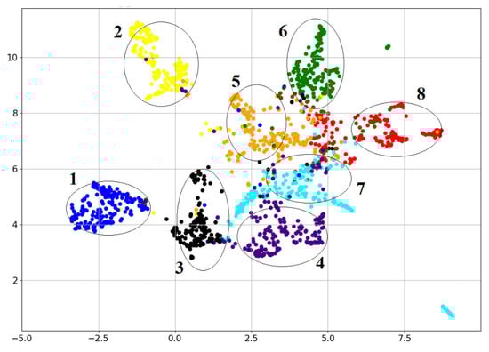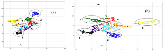 - McInnes, L.; Healy, J.; Melville, J. UMAP: Uniform manifold approximation and projection for dimension reduction. arXiv 2018, arXiv:1802.03426. [Google Scholar] [CrossRef]