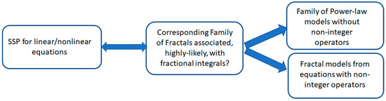 21]. If such a general connection were found, then these modified fractals generated by SSP would give rise to a new class of fractional integrals. Instead of imposing replacement equations (without clearly justifying their physical significance) for the fitting of real data, this is a more natural technique to connect fractals with various versions of fractional integrals. We provide the following scheme to provide a deeper understanding of “the location” that distinguishes power-law models from fractional models. We provide the following scheme (