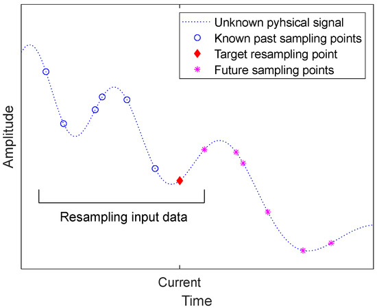 From the perspective of a target time point for calculating the resampled signal, one or multiple future sensor measurements must be known for signal interpolation (Figure 1). However, zero-delay resampling can only be applied to low-frequency signals, extrapolation beyond known past samples leads to stability problems.