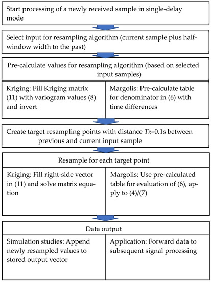 The simulation procedure is shown as pseudo-code in Figure 3. After receiving a new sensor sample, the input window for the resampling algorithm is selected, containing the current and several past samples. If upsampling is required, i.e., multiple output samples must be calculated per input sample, code execution time can be largely reduced for Kriging and Margolis. The output points use all the same input samples with identical time differences between them. The left side matrix in (11) for Kriging remains constant, as well as the denominator in (6) for Margolis. The inversion of the Kriging matrix can be pre-calculated. An explicit call of QR-decomposition resulted in the same RMSE as calling the standard matrix inversion method ‘numpy.linalg.pinv’ in Python. Both options required similar processing time. For Margolis, the denominator values were pre-calculated and stored in a table.