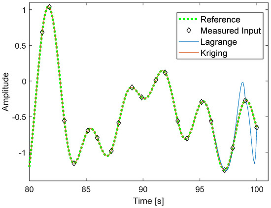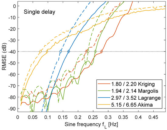 As a statistical method, Kriging is suitable for handling noise in both scenarios (Figure 8). Distortions are mainly caused by high-frequency components of the noise. The contribution of the spectral components of the noise can be estimated based on the RMSE caused by different sine frequencies (Figure 11b). The amplification of noise distortions by Kriging with fL > 0.3 Hz is limited to 4 dB or a factor of 1.6 in the single-delay scenario (Figure 11b), whereas high frequency noise distortions are amplified by up to 21 dB for Margolis and 28 dB for Lagrange (beyond plotting scale in Figure 11b).