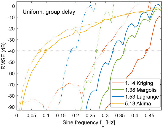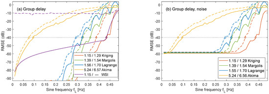 Adding noise with RMSA = −60 dB did not significantly affect the OSR for EMax = −40 dB (Figure 9b). The RMSE of all methods, except Akima, approached for fL < 0.25 Hz the noise floor of −60 dB, with an offset between 0.8 dB (Kriging) and 1.9 dB (Lagrange). All methods proved to be stable towards noise in the group-delay scenario, although they did not provide additional noise smoothing capabilities.