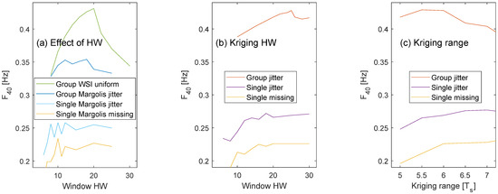 During the first test, the effect of the Kriging range and nugget value on the frequency response was evaluated according to the method described in Section 3.1. Even a small nugget of ng = 10−6 has a significant effect on the frequency response (Figure 4). The corner frequency drops from 0.5 Hz to 0.35 Hz. Kriging with r = 5·TS or r = 6·TS has almost the same frequency response as windowed WSI. Higher range values create ripples and slightly decrease the corner frequency. The values r = 6·TS and ng = 0 were used as standard setting until further testing.