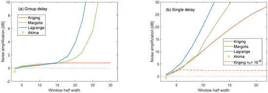 Kriging is the only method that can make use of a higher number of input samples by increasing HW, without increasing its noise sensitive at the same time. This noise stability requires to set the nugget value in the single-delay scenario (Section 4.4) with the disadvantage that the corner frequency of the equivalent filter is reduced (Figure 4).