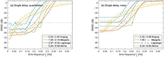 Kriging was the best of the four tested methods in the group-delay scenario, regarding all test cases including jitter, missing samples, noise, and higher SNR. Margolis and Kriging provided similar simulations results for noise-free signals in the single-delay scenario (Figure 10). If noise is added, Margolis is the more accurate method for fL > 0.18 Hz. For lower frequencies, the RMSE remained above −47 dB, and Kriging provided more accuracy (Figure 11b).