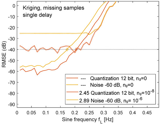 The nugget value was already adjusted in Figure 11. In theory, the variogram nugget is equivalent to the squared mean amplitude of an additional white noise distortion (Section 2.7). For the single-delay scenario with noise, the nugget was set to ng = 10−6 for noise with −60 dB RMSA and to ng = 10−8 for 12-bit quantization. Kriging interpolation without nugget resulted in a significantly higher RMSE (Figure 12).