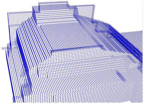 The 3D geometric model of the SO is simplified for the purposes of this study, compounded by the limited amount of detailed information that exists relating to the Matryoshka doll-like configuration of the structure (the original concrete building and other materials, enclosed by the outer shell) and the unknown source-term contained within. As such, the SO was modeled as a suite of isotropic gamma point sources with a step of 1 m, located on its outer shell, as shown in Figure 1. No internal sources or other available information is hence used.