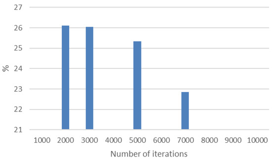 The dependence of the MAPE percentage error on the number of iterations of the algorithm is shown in Figure 6. Supporting other assessment metrics, this MAPE error is easy to interpret and has a scale for assessing the quality of modeling results, allowing an assessment of the quality of the model.