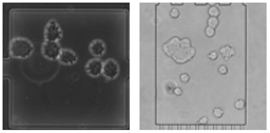 Samples from the data sets of CHO-K1 suspension growth. Bright-field microscopy image on the right, phase-contrast microscopy image on the left. Smudges on the chip can be seen in the form of faint, small circles within the fluid solution. The scale bars do not appear in the working data.