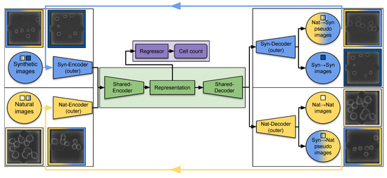 One of the VAEs works on proxy data, and we will refer to it as VAE-syn, while the other one processes natural data (VAE-nat). The differing visual features of proxy and real data are accounted for in the separated layers, while the weight-shared encoder and decoder rely on and enforce a similar representation of the determinant image characteristics. In addition to auto-encoding, the architecture works on data with known labels in a supervised manner by the addition of a three-layer fully connected neural network regression model for the actual cell counting, based on the shared representation of the VAEs.