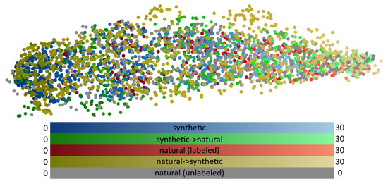 It can be seen that data that have been translated from synthetic to natural (green) tend to encapsulate the synthetic data (blue); this is more so the case for the natural data that are translated to synthetic (yellow), which encapsulate the original natural data (red and gray). This can be interpreted as semantic coverage, which means that, for every possible natural, unlabeled data point, there are labeled data points nearby, demanding only minor abstractions of the regressor to be able to achieve a meaningful cell prediction.