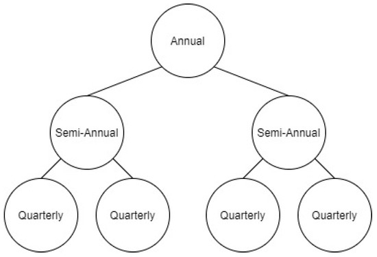 In what follows, we present a brief but complete explanation of the temporal hierarchies method as well as the alternative estimators that can be used within the framework to reconcile the base forecasts. Without loss of generality, in our discussion, we consider quarterly data (m = 4) as the temporal level at which the time series is originally observed and denote it using the m-dimensional vector . Semi-annual and annual data can then be constructed by using non-overlapping temporal aggregation. The temporal hierarchy in this case is structured as shown in Figure 2.