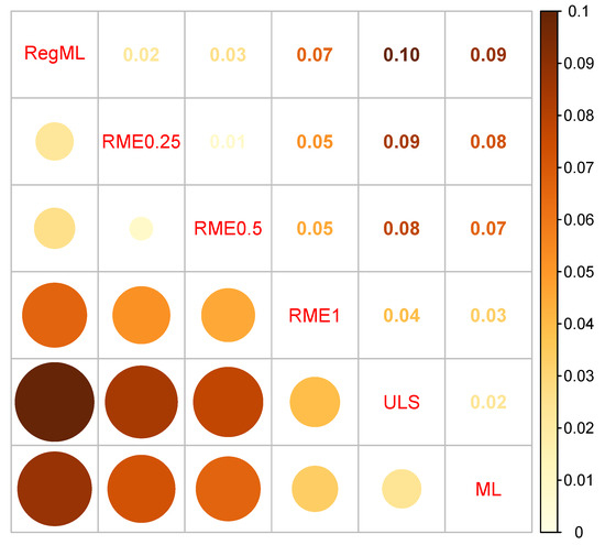 In general, RME with performed quite competitively to RegML. Given the fact that RMSE is computationally much less demanding than RegML, one could prefer model-robust SEM estimation in the presence of unmodeled residual error correlations using the robust loss function in practical applications.
