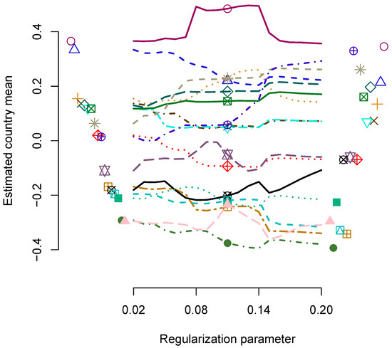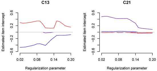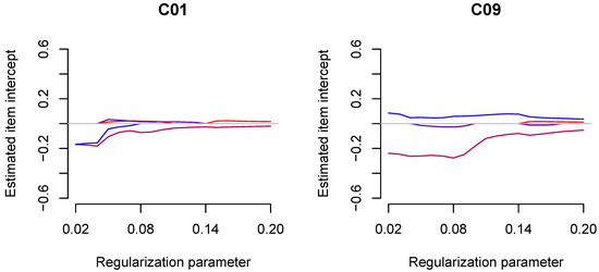 In regularized estimation, a nonidentified SEM is typically utilized, and only outlying entries in and are estimated differently from zero. To ensure the identifiability of model parameters, regularized estimation relies on sparsity assumptions [51,52,53] in item intercepts and residual correlations. The main idea in regularized ML (RegML) estimation is that a penalty function is subtracted from the likelihood. The penalty function controls the sparsity in a subset of the estimated parameter vector . For example, the subset in might refer to nondiagonal residual error correlations or group-specific item intercepts.