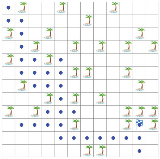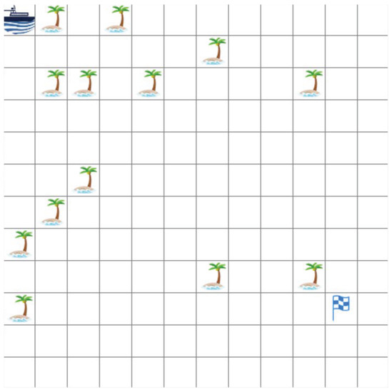 Due to the huge cost in the real environment, in order to verify the autonomous navigation function of the ship, we will simulate the whole ship navigation space. The whole navigation is carried out in feasible waters with obstacles. Obstacles do not represent fixed islands, but also shallow waters, wave areas and inaccessible locations [23]. In the whole navigation area, every position experienced by the ship is affected by wind and waves. Waves more than 3 m are dangerous areas [24]. The influence of wind and waves on the ship is also considered in the article. Marine meteorological data are from European Centre for Medium-Range Weather Forecasts(ECMWF) [25]. Figure 1 shows the path planning environment modeling of this paper. The width and height set by the test simulation are 12 × 12, and the cell is set to 40 pixels. The position of the robot represents the starting point, the green square represents the obstacle, and the flag represents the target point. The agent needs to find a path from the starting point to the target point in the shortest cost, which should avoid obstacles perfectly. In this paper, dynamic means that in addition to the starting point, obstacles and target point are randomly generated in the process of agent travel. Dynamic obstacle modeling is shown in Figure 2.