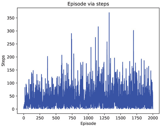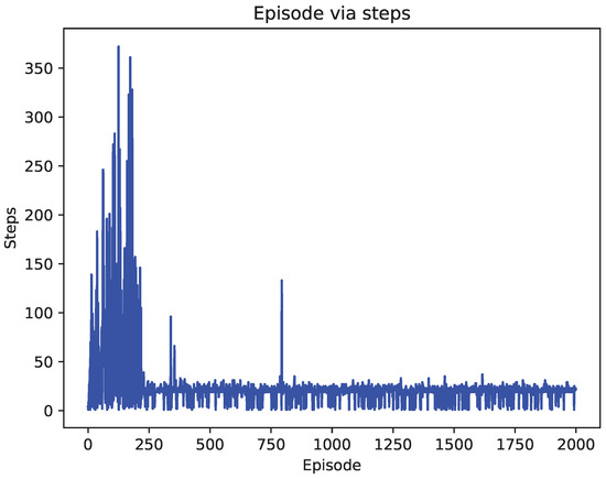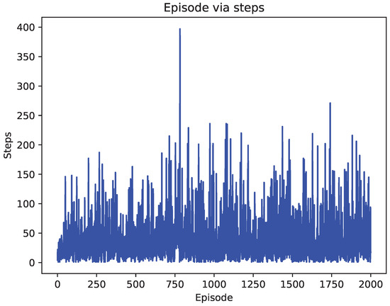 In the simulation, when the ship arrives at the destination, the reward value is 1, and when the ship moves towards the obstacle, the reward value is . Moreover, the reward value is 0. The maximum episode setting in the paper is 2000. With the execution of the episode, the steps and cost of each episode of the ship are shown in Figure 6, Figure 7, Figure 8, Figure 9, Figure 10 and Figure 11. In Figure 6, the ship based on the improved DQN algorithm is constantly explored, and the steps will change dramatically. When the algorithm is executed to the 1750th episode, it reaches stability. The value of steps is 21. The steps of the original DQN algorithm are compared, as shown in Figure 7. In the whole episode process, the original DQN has been in dynamic exploration and can not move towards the established goal due to uniform sampling. Figure 8 shows the steps performance of Q-learning algorithm. Q-learning has explored the longest step, but the algorithm is not stable. Figure 9, Figure 10 and Figure 11 shows the cost of the whole episode. In this paper, cost is the reward obtained by the ship when it travels to the target point. It can be seen from the figure that the reward of the improved DQN algorithm has always been at the maximum in the 1750th episode. The performance of the other two algorithms is weaker than that of the improved DQN.