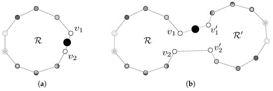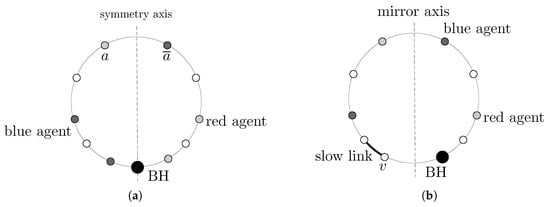 - (2) By contradiction, let be a deterministic solution algorithm, let the ring be unoriented, and let be the first moving agent. Let us assume, without loss of generality, that (according to the algorithm) moves to its left. The adversary chooses as the location of the black hole the node to the left of . Then, it places another agent to the immediate left of the black hole, and assigns to a sense of orientation opposite to the one of . Moreover, the adversary does not activate any other agents until both and make their move. This implies that, since is deterministic, will choose right as its moving direction. Therefore, both and will eventually disappear into the black hole, a contradiction. □