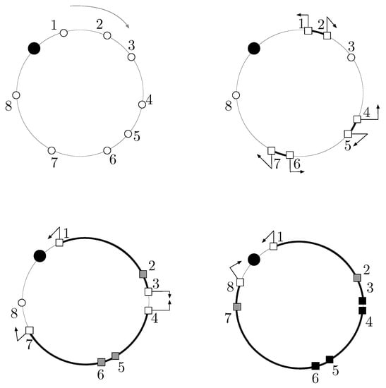 - Chalopin, J.; Das, S.; Labourel, A.; Markou, E. Tight bounds for Black Hole Search with scattered agents in a synchronous ring. Theor. Comput. Sci. 2013, 509, 70–85. [Google Scholar] [CrossRef]