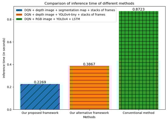 In the fourth experiment, we calculate and compare the time taken to perform a single forward pass (inference time) between our proposed framework and the related conventional methods. Our framework utilizes a DQN as the core DRL algorithm, depth images as our input, segmentation map as the object detection module, and stacks of consecutive frames as our state representation. The alternative framework replaces the segmentation map with the YOLOv4-tiny model for the object detector. This approach is designed for UAVs that are not equipped with segmentation cameras. The conventional method uses a DQN for the DRL algorithm, RGB images as input, YOLOv4 as the object detector, and LSTM to capture the historical movements of the objects. The inference time of the above methods is compared in Figure 1. As we can see from the plot, our proposed framework shows the smallest inference time, which proves its lightweight nature.