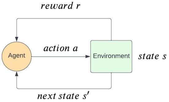 Almost every RL problem is modeled as a Markov Decision Process (MDP). A MDP [27] is a powerful framework for modeling decision-making problems in which the outcomes are unpredictable. The MDP is driven by a tuple of , where is the set of states (state space) and each state is a representation of an environment observation, is the set of actions (action space), is the state transition function which indicates the probability of getting state and reward r when taking action a in state s, is the reward function, and is the discount factor, which helps to converge the infinite sum of rewards in continuing tasks. The agent takes actions in accordance with its policy . A policy is a mathematical function that receives a state and returns the probabilities of taking each action in the action space. A policy can be either deterministic or stochastic. The aim of a policy is to maximize the expected discount return , where is sampled from the policy . The MDP framework can be visualised in Figure 2.