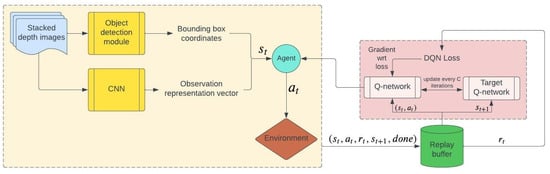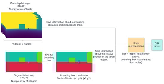 State representation allows the agent to identify different situations and make decisions based on the environment. To create a complete observation, the UAV’s front-mounted camera processes the segmentation map, outputting the target object’s bounding box coordinates. These coordinates are then combined with a short video consisting of five consecutive depth map images from the same camera view, each delayed by 0.1 s.