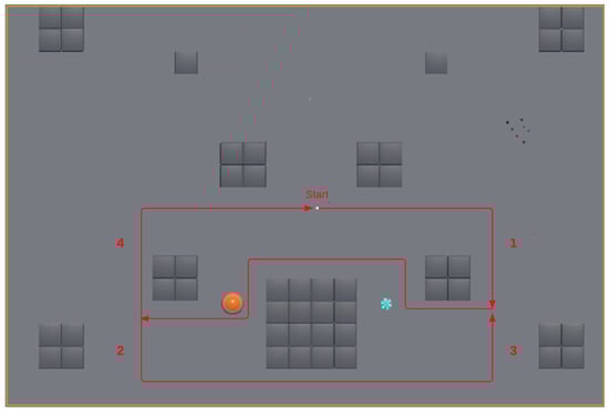 We design an 11,500 m rectangle area with random obstacles scattered around. Our target object can move freely in the environment. The path of the target object is predefined and shown in Figure 5. To avoid bias toward certain behaviors, we keep the number of right turns and left turns balanced (eight right turns, eight left turns). There is only at most one target object moving in the environment at a time. We place obstacles with different sizes and shapes to allow the agent to learn different situations.