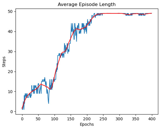 We record the average return and the average episode length to evaluate the agent. For the average episode length, the maximum number of steps per episode is set to 100, as described in Section 4.8. However, if the agent is able to follow the target for 50 consecutive steps, the episode also ends. Figure 8 shows the average episode length when training the DQN agent. We can see that, in the beginning, the agent operates poorly because it was instantiated with random parameters. It usually collides or loses the target and ends the episodes early before reaching 100 steps. After a few more epochs, it learns how to perform the task moderately. Nonetheless, it never reaches 50 steps until the 225th epoch. After that, the agent knows how to keep track of the target consistently and finish the episodes in around 50 steps. This is also the maximum number of consecutive steps that we prescribed above.