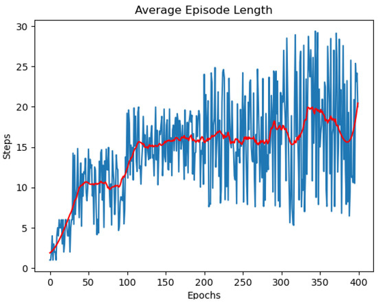 On the other hand, it surprises us that the result from the DDPG is much worse. The average episode length of DDPG is illustrated in Figure 9. We can see that the average episode length fluctuates and does not converge. An explanation for this could be that the DDPG is more complicated than the DQN. It has double the number of networks than the DQN; hence, it needs much more epochs to converge. Although we might observe an improvement if the DDPG is trained with more epochs, our goal is not trying to make the DDPG converge but we want to test and choose the better DRL algorithm for the dynamic object tracking task. Being smaller in size, able to converge, and needing a shorter training time, we have enough evidence to show that the DQN outperforms the DDPG in this specific metric.