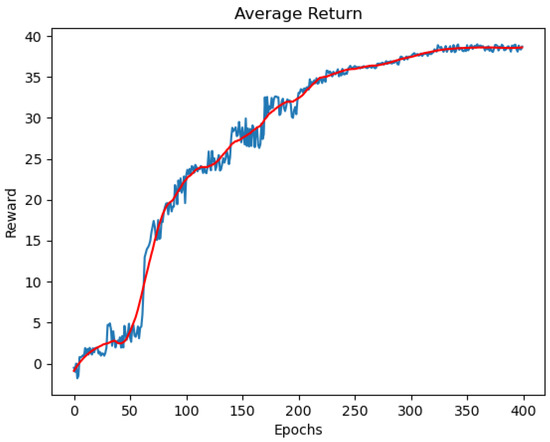 The other metric that we keep track of is the average return. Shown in Figure 10 is the average return of the DQN agent. In the first few epochs, the agent is unable to keep track of the target and usually made collisions; thus, making the average reward low. The reward increases gradually and plateaus at 37 after 300 epochs because at that time, the agent has managed to reach the maximum steps per epoch, as we described above in Figure 8.