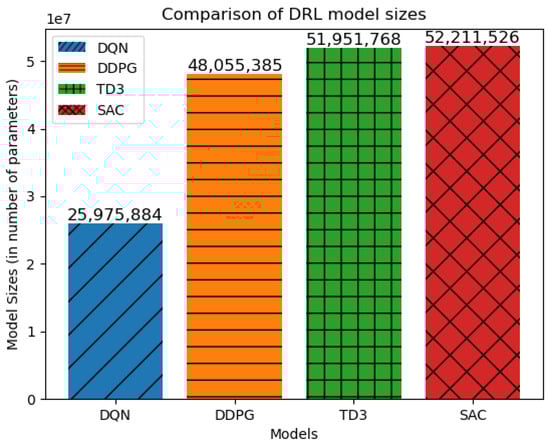 The first experiment is to reason why we chose the DQN. We test different algorithms in our framework (DQN, DDPG, TD3 [32], SAC [33]) and compare the model sizes (in terms of the number of parameters). We use the same network architectures in all algorithms to obtain a fair comparison. It shows that the DQN requires the least computations, and from Figure 10, we can see the DQN still converges and performs well for this task. The DDPG and TD3 have two networks, and the SAC has three networks that result in more parameters compared to the DQN, which has only one network. This experiment consolidates the reason why we chose the DQN as we prioritize the lightweight but effective approach. The exact comparison results can be seen in Figure 12.