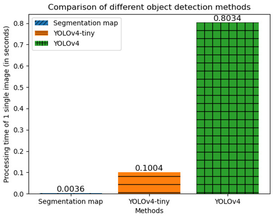 The second experiment is to compare our proposed object detection module with other usual methods. We monitor the processing time required to detect an object and return the bounding box from a single image using three methods: a segmentation map, YOLOv4-tiny, and YOLOv4. The faster the processing time is, the fewer computational resources it requires to complete the task. The recorded processing time is shown in Figure 13. The plot shows that our segmentation map method has the fastest processing time.