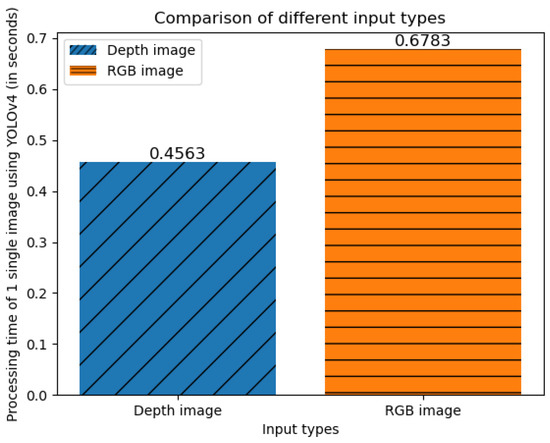 Comparison of the processing time to detect objects in a single image of different input types (depth and RGB) using the YOLOv4 model (in seconds).