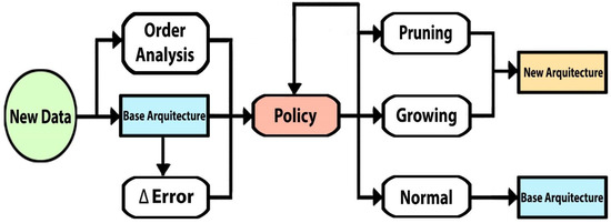 As it was mentioned previously, the algorithm is based on the elaboration of a decision-making policy that allows determining the action to be carried out on the LSTM network architecture (growing, pruning, or normal) with respect to the evolution of the data during the update process, in such a way that it allows the network to dynamically adapt its architecture to maintain, transfer and distribute the knowledge to its next version. The flowchart of the methodology is illustrated in Figure 2.