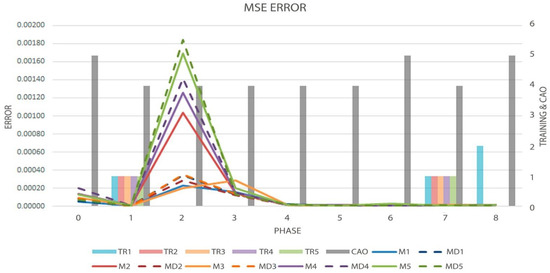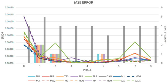Figure 6 shows the evolution of the MSE error in each of the 10 models, the order obtained, and the decisions made at each phase during the first test (series 1). The regular lines describe the evolution of the errors obtained by the vanilla models and the dotted lines describe the errors acquired by the proposed models. The bars with the prefix TR show how the DyLSTM models were trained, and which change of architecture was run, being 0 as normal run, 1 as pruning run, and 2 as growing run being this metric measured in the right axes of the graph. The gray bar is the result of Cao’s method, which is also measured in the right axes of the graph. Each model has its own color code: blue for the first models, red for the second ones, orange for the third, purple for the fourth, and green for the fifth models.