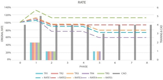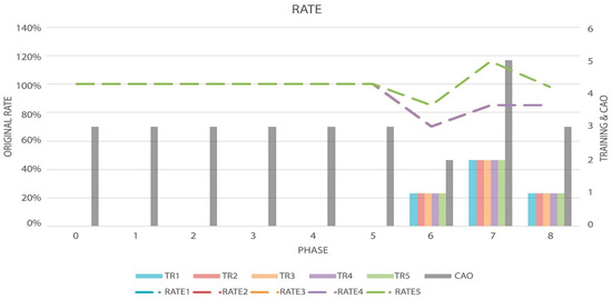 Graph of the Topology Rate (Dotted Lines, measured by left axis), Order evolution (CAO), and the decisions made by the algorithm (TR-Bars, the last two metrics measured by the right axis) in test five.
