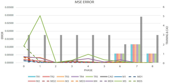 Graph of the MSE metric (Solid and Dotted Lines, measured by left axis), Order evolution (CAO), and the decisions made by the algorithm (TR-Bars, the last two metrics measured by the right axis) in test five.