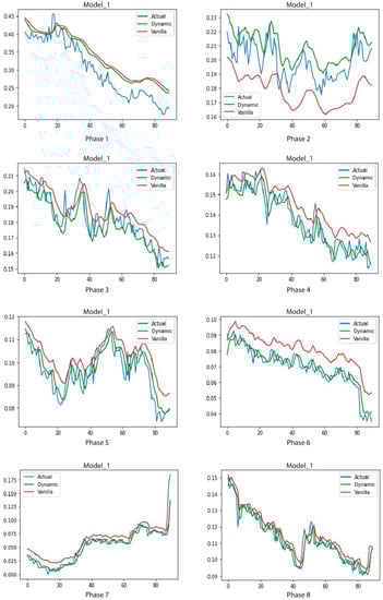 Unifying the three methods of training (pruning, growing, and normal) of the proposed system, makes the models able to identify a global trend of the data and get better results in later phases. Figure 11 shows the evolution of models 1 (Vanilla/DyLSTM) over phases 1 to 8 of series 4. This figure presents how model 1 trained with the proposed method acquires better results and anticipates trend changes meanwhile more phases have been processed.