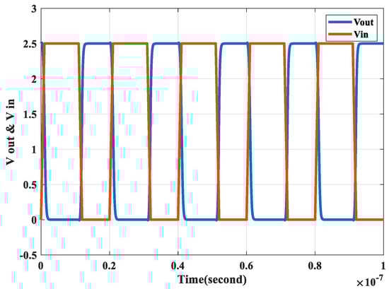 The fundamental technology of any digital IC relies on the inverter. The inverter serves as the basic block. Its switching characteristics play a critical role in describing the technology. The performance speed of a digital system is contingent on the switching characteristics of the logic gates. This study employs the MA technique to derive the optimal switching characteristics of CMOS inverters. By analyzing the switching operation of the CMOS inverter, the fall and rise time (tf and tr) and propagation delay times (tPHL and tPLH) are determined [,,,,,,]. Figure 2 shows the CMOS inverter, while Figure 3 displays the voltage waveforms.