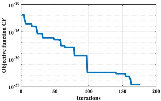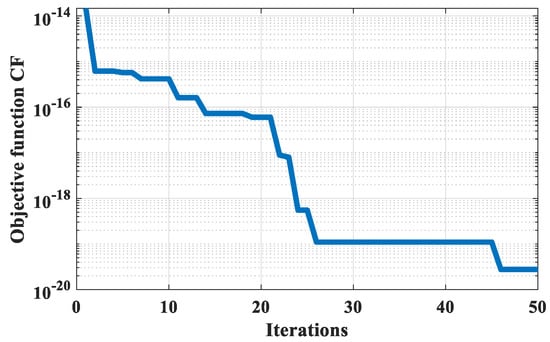 Table 9 shows a comparison of the MA results with results obtained by different optimization algorithms. The optimal value of the CF (in ps) of the MA is compared to the optimal value of CF using PSOCFIWA [], DE [], ALC-PSO [], CRPSO [], PSO [], HS–DE [], and SOS []. The results show that the suggested MA outperforms most of the widely used optimization methods in finding the optimal CMOS inverter design with the lowest CF value.