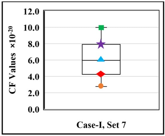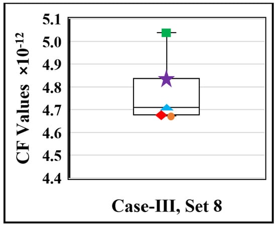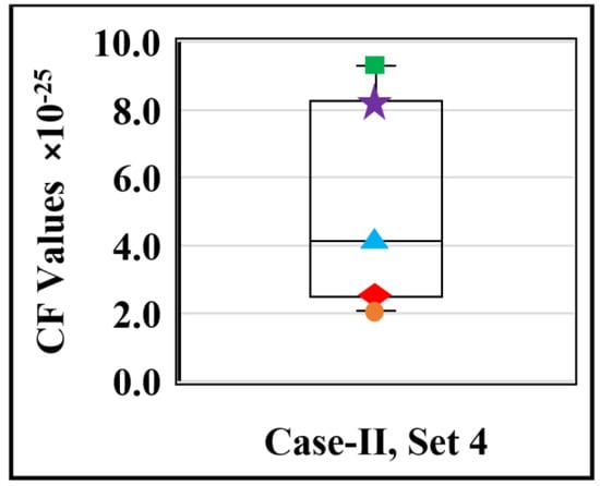 Figure 14 shows the box and whisker plot for the fourth design set of Case II. The green square represents the maximum value, the purple star represents upper whisker, the blue triangle represents median value, the red diamond represents the lower whisker, and the orange circle represents the minimum value. The median value is found to be 4.14 × 10−25, the maximum value is 9.31 × 10−25, the minimum value is 2.07 × 10−25, the lower whisker is 2.6366 × 10−25, and the upper whisker is 8.2718 × 10−25.