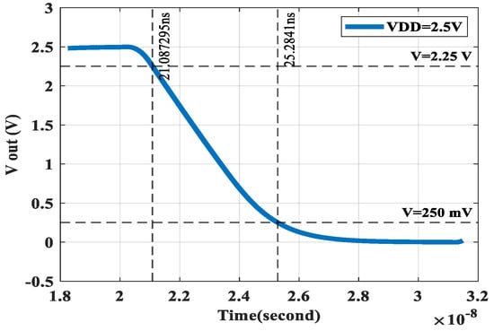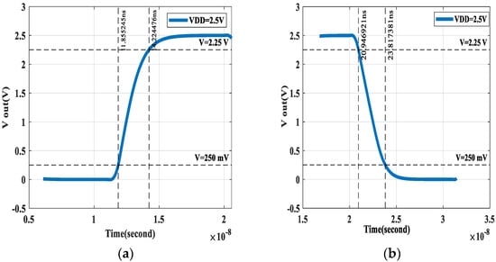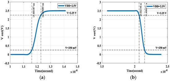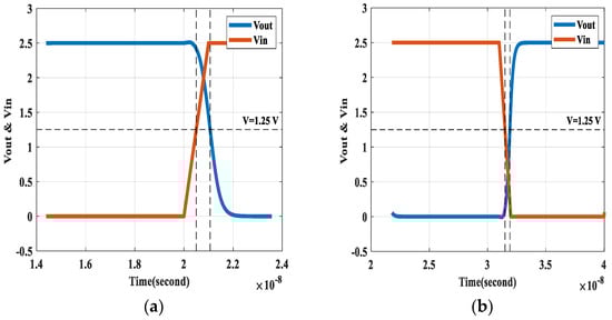 The duration between the 50% in the rising input voltage and the 50% in the falling output voltage represents the high to low propagation delay. On the other hand, the low to high propagation delay pertains to the time delay between the 50% transition of the falling input voltage and the 50% transition of the rising output voltage. These values can be determined using Equations (11) and (12), respectively [,,,,,,].