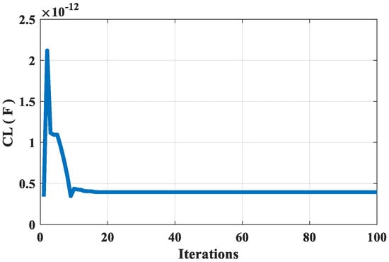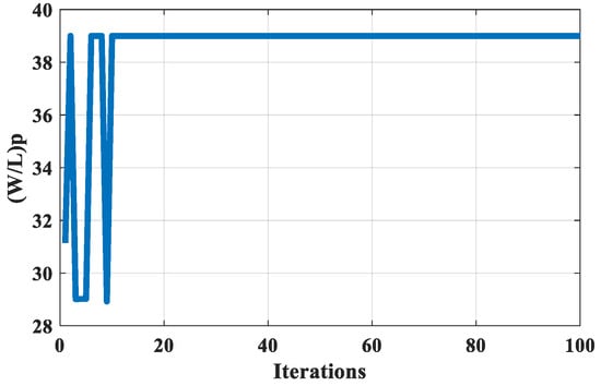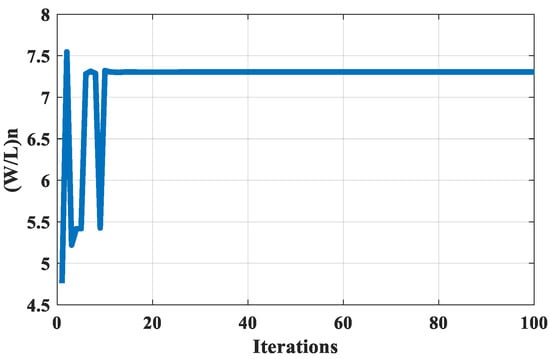 Figure 4 shows the convergence of the objective function, given in 13, with the iterations for the seventh design set. In Figure 4, it can be seen that the objective function reaches an optimal value of 2.7473019 × 10−20 s. The 7th design set wass chosen since it has the lowest value of the cost function. Figure 5, Figure 6 and Figure 7 show the convergence plots of the inverter design parameters, CL, (W/L), and (tf), for the same design set. In Figure 5, the optimum value for the load capacitance is 0.7122034 pF and it starts to converge after 24 iterations. The aspect ratio (W/L) optimum value for the seventh set is shown in Figure 3 to be equal to 1.8113496. The optimum value for the fall time is equal to 2.1820107 ns as shown in Figure 7.