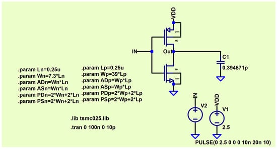 The inverter is known as the basic logic gate of any digital Integrated Circuit (IC) technology, and it is an integral part of all digital systems. With the emergence of new technologies, designers are focusing on building the basic blocks, such as inverters [,]. Much work has been conducted to overcome the performance bottleneck in CMOS inverters []. The inverters’ performance has been investigated in order to come up with robust circuits []. As technology has been sized down, circuit design has become more challenging, and the need for designing accurate and fast circuits with low time delay has become an important issue [,]. The switching characteristics of the inverter are the fundamental parameters used to describe the inverter’s performance. Thus, the switching speed of the inverter’s circuit should be optimized before the design steps to achieve symmetrical switching. Switching time from high to low or from low to high depends on the channel width, length of the transistors, and load capacitance CL.