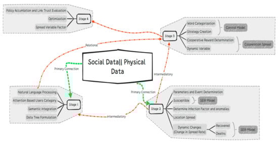 The decision spread model block diagram in Figure 1 represents the process for analyzing social and physical data to determine the overall spread factor of an event. The block diagram is divided into four stages. Stage 1 represents the preprocessing and semantic integration of social data by creating an attention-based user category considering physical data events. This stage is important as it provides a deeper understanding of the relationship between social data and physical data events. Stage 2 is physical data analysis using the susceptible exposed infected recovered (SEIR) model, which provides essential information such as hyper parameters for events, infection factor, location spread, and change in spread rate. This stage provides crucial information on how an event is spreading and helps to predict its future spread. Stage 3 represents the cooperation spread and control model [] to determine the spread variable. This stage takes into account the interplay between social and physical data to determine the overall spread factor. Finally, Stage 4 represents the policy determination and optimization for analysis. The results from the previous stages are used to make informed decisions about how to mitigate or control the spread of an event. This stage is critical for making decisions on how to respond to an event based on the information obtained from the previous stages.