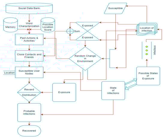 This is considered in order to understand the spread and reward processes considering granularity. The social data bank analysis provides a building block to identify susceptible nodes by monitoring the activities of friends and relatives. The algorithm achieves this by scrutinizing word clusters and identifying hidden outbreaks within the network. These rewards and allocations help track the progression of disease and offer insight into its impact on different individuals and communities. The SEIR model serves to simulate the dissemination of infectious diseases, providing information on parameters such as event occurrence, infection rate, geographical spread, and alterations in the spread rate. The SEIR model is supplemented by data from physical sources, contributing to a more accurate representation of the disease’s propagation.