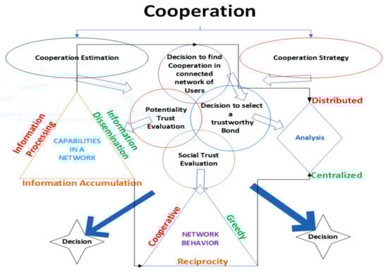 To identify vulnerable nodes, word categories were grouped into positive feelings regarding COVID-19. The study created a sampling space with homogeneous spread and actions, but did not fully represent influencing locations. Positivity rates in specific cities were calculated using physical data and similarity scores to map exposed users. Figure 4 shows that a cooperation estimation and strategy are key components, involving information processing and network distribution. A triangular agenda visually represents this, and the data assess social trust, trust likelihood, and reciprocity-based network actions. Distributed analysis, decision-making, and reliable network ties form the cooperation strategy to foster social trust and effective cooperative spread.