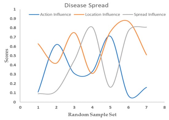 where represents a location rating for the spread corresponding to each action. The location rate calculates the cumulative infection location rate by considering the similarity between users and their relationship with other entities. It takes into account the observed entities and their relationships, providing a metric to measure the spread of influence or information within the network. This analysis is conducted using Twitter data related to COVID-19 and physical data obtained from the Johns Hopkins website [].