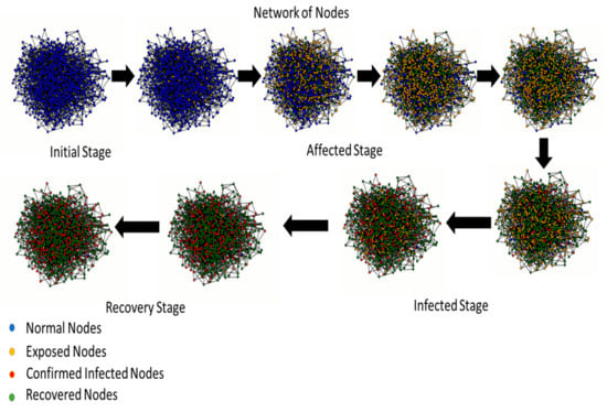 The SEIR model is a popular epidemiological model for the spread of diseases. To predict the development of infectious diseases in a community, the SEIR model reflects the progression of individuals through several stages of infection, namely from susceptible to infected to recovered. Individuals are divided into four stages according to the SEIR model [,,,,]. Susceptible (S): People in this stage are at risk of contracting the disease, but have not been exposed to it yet. Exposed (E): People in this stage have been exposed to the infection but are not yet contagious. They may not have symptoms just yet because they are still in the incubation stage. Infected (I): People who are in this stage can spread the illness to others. Recovered (R): Those in this stage have made a full recovery from the illness and have developed immunity.